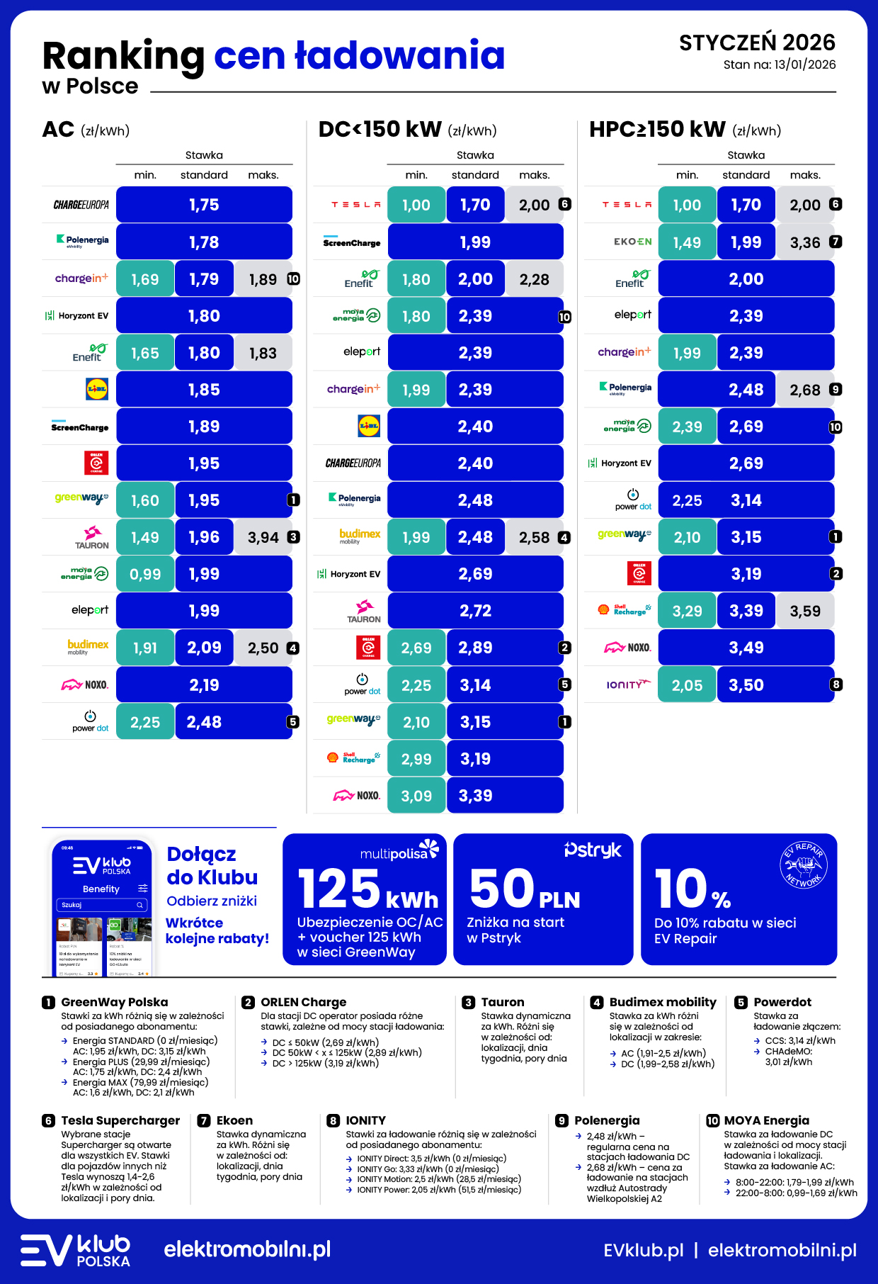 W styczniowym rankingu uwzględniono stawki następujących operatorów: Tesla Supercharger, ChargeEuropa, Polenergia eMobility, ChargeIn+, Horyzont EV, Enefit, ScreenCharge, Lidl, eleport, ChargeIn+, Budimex Mobility, Tauron, MOYA energia, Powerdot, Greenway Polska, Shell Recharge, NOXO, IONITY, Ekoen.